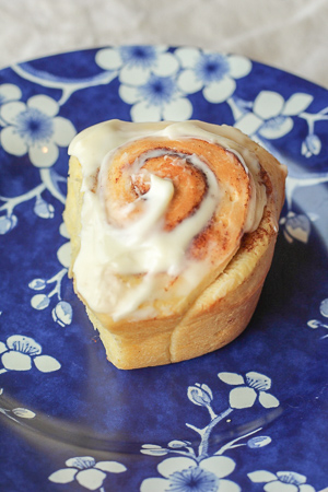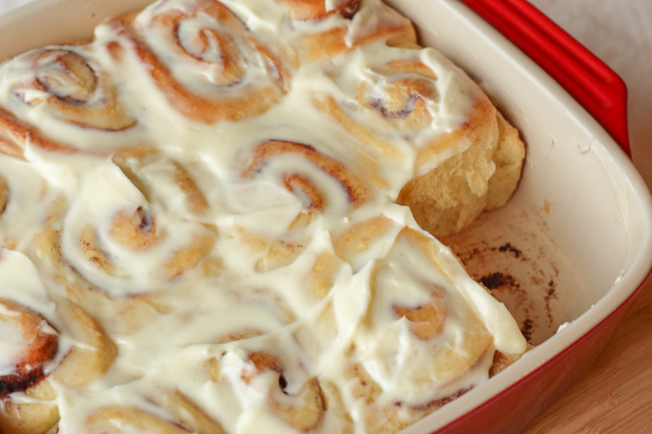 When the rolls have cooled a bit – at least 15 minutes, they can be frosted! Combine the cream cheese, powdered sugar and vanilla in a bowl, and stir to combine. I used a spatula for this. Then spread the frosting over the slightly cooled cinnamon rolls and serve!