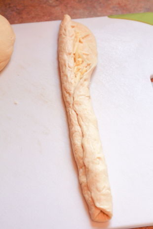 Fill each pretzel with the cheese and garlic powder, and then fold the pretzel around the cheese. I start folding one side of the dough, and shown above, and then bring the other side of the dough on top of the other. You can see that below, where I snapped a quick photo just before I had the whole pretzel closed.