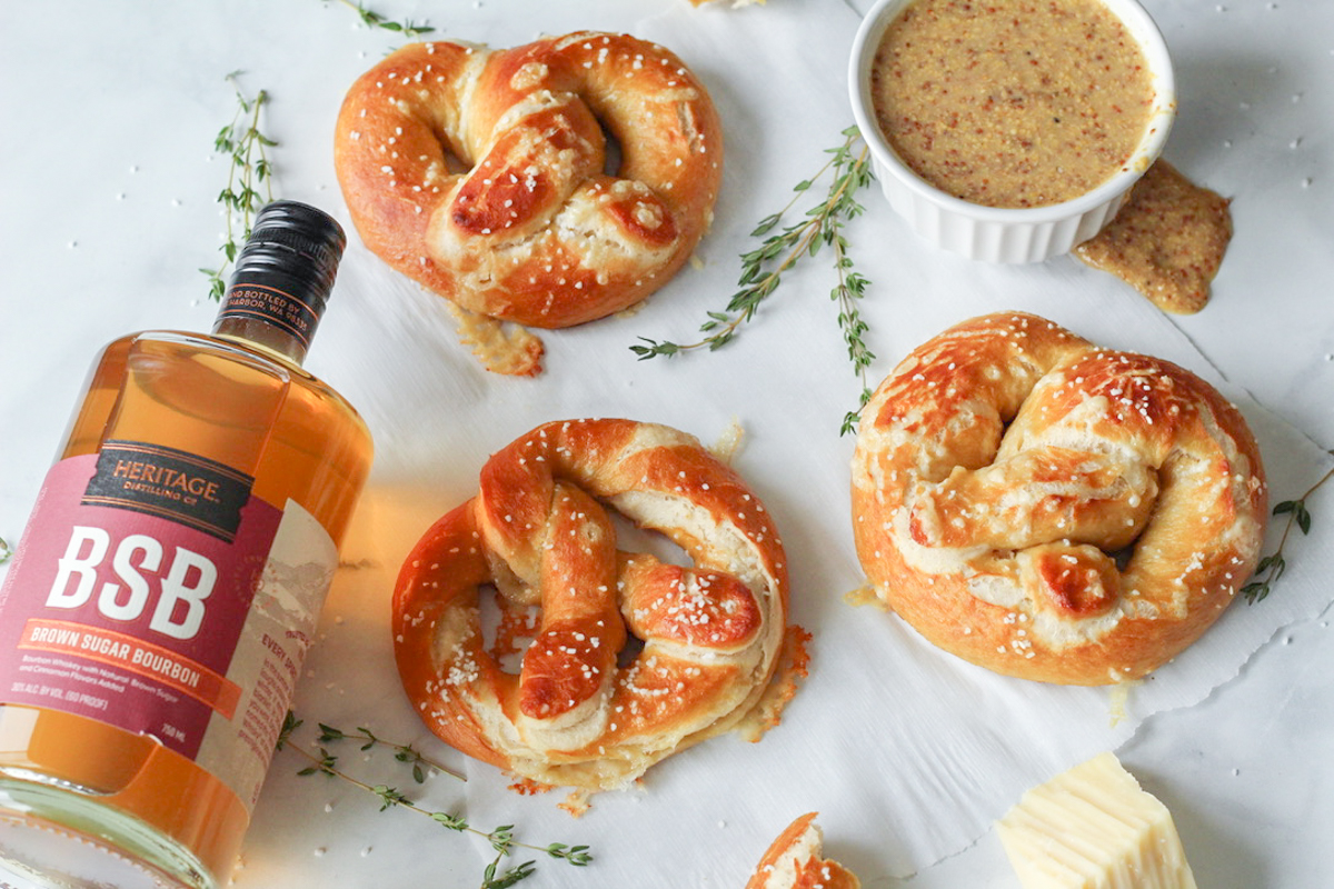Easy and delicious cheddar stuffed soft pretzels! Soft bread, gooey melted cheddar filling, all finished with flavorful bourbon honey mustard. Taste bud explosion!
