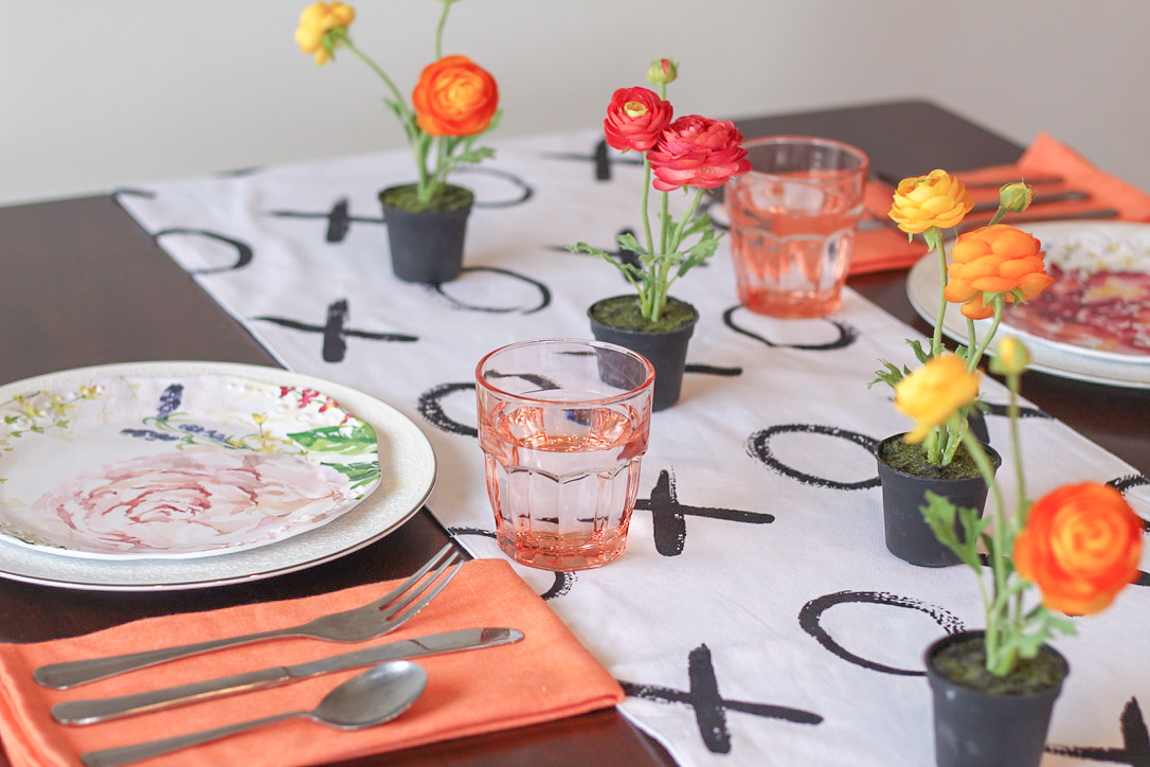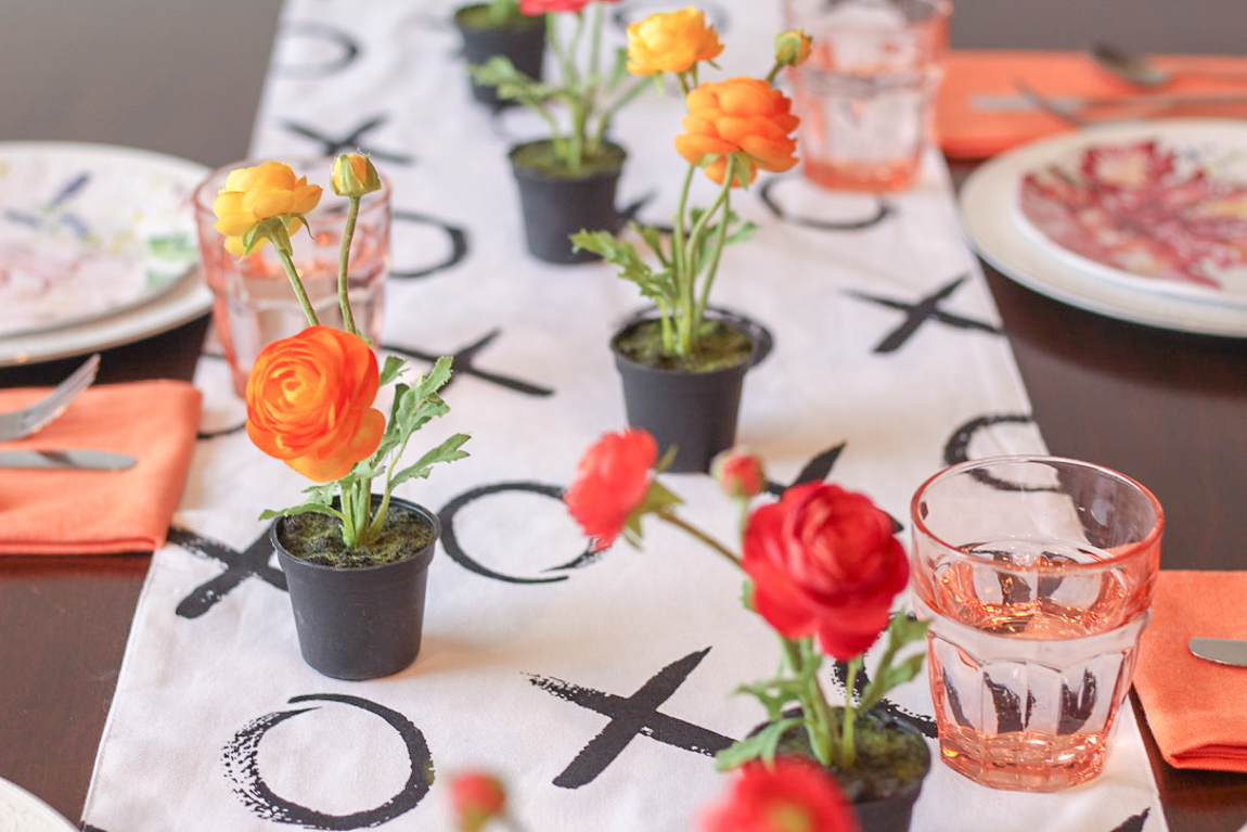 I instantly fell in love with these adorable mini faux potted ranunculus in yellow and red! I knew that I wanted a bright floral arrangement since the table runner is a perfect backdrop. These work perfectly, because they spread color all across the table and also tie into the color of the napkins. I also like the price point of these faux flowers, because achieving a similar look with live flowers would have been a lot pricier. Plus now I get to enjoy them forever!