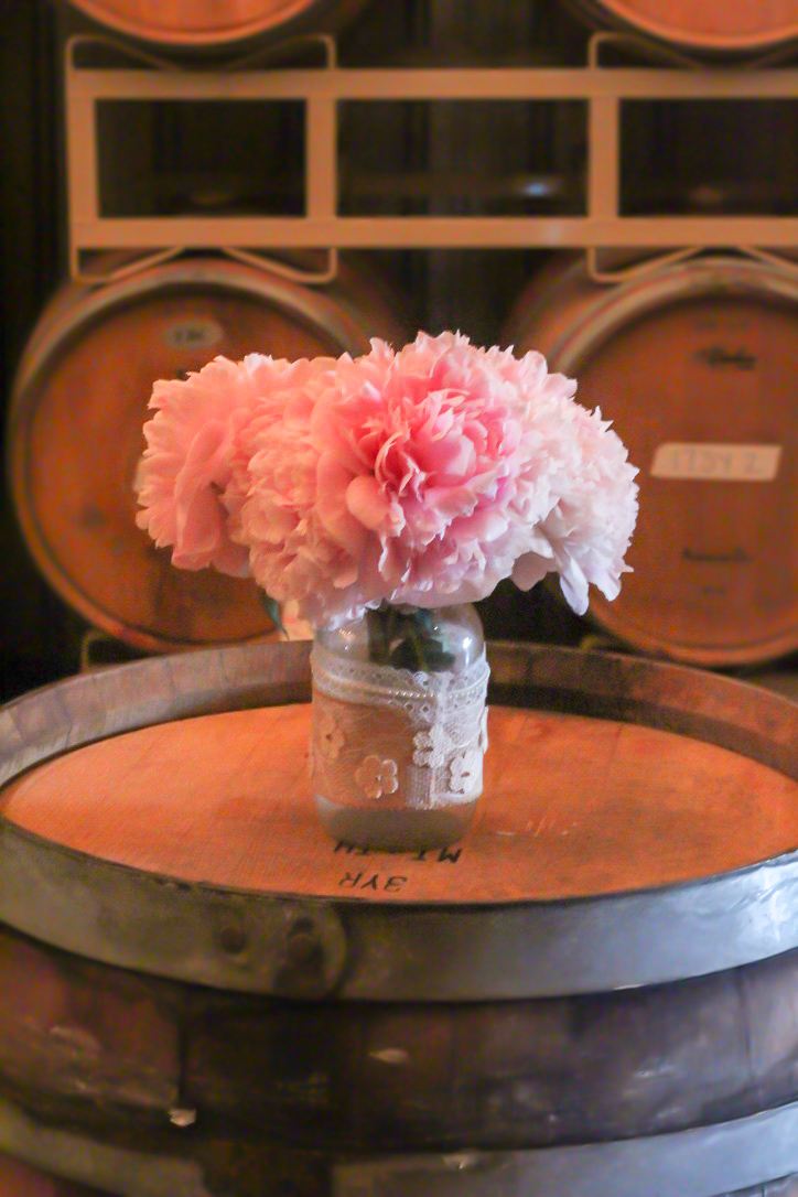 We picked pink peonies from the local you-pick flower farm, and arranged them in burlap and lace mason jars. The flowers ended up being a perfect pop of color inside the barrel room!